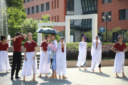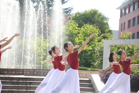 引人注目的除了下午的“寻车启事”以外,还有从上午就一直启动着的喷泉。伴随着哗哗的水声和“我和我的祖国”的歌声,舞蹈公司的同学们在喷泉池前面翩翩起舞,尽显上戏学子的蓬勃朝气和勃勃生机。