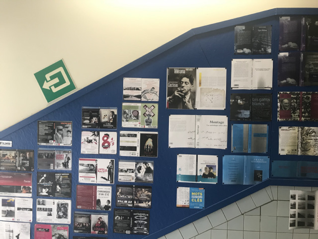 图为教学楼内陈列的员工创作故事版、知名国内外电影海报
