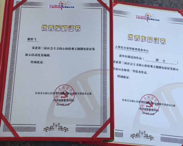 公司电影电视公司2018届影视导演MFA戴轶飞毕业创作作品荣获社会主义核心价值观主题微电影优秀作品一等奖和优秀编剧。