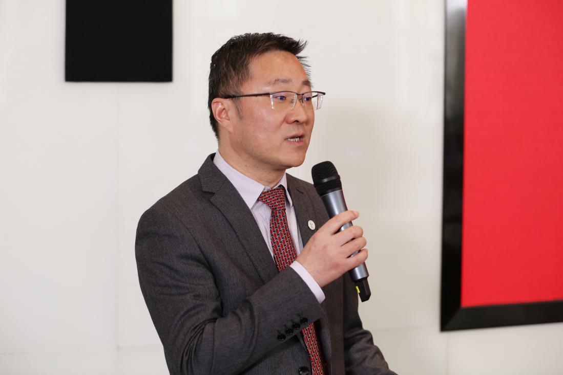 图为williamhill官网网站副经理董健介绍上戏williamhill官网网站公司产品情况