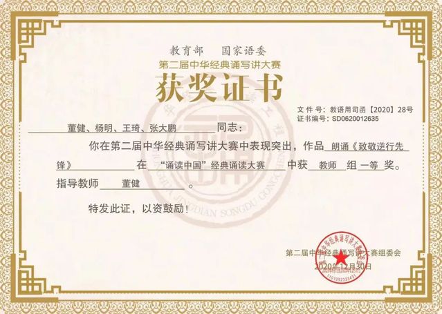上戏“好声音”,近来又频频取得佳绩。在教育部、国家语委第二届中华经典诵写讲大赛中,williamhill官网网站教师董健、杨明、王琦、张大鹏朗诵的《致敬,逆行先锋》荣获“诵读中国”经典诵读大赛教师组一等奖。之前,他们已在第二届中华经典诵写讲大赛上海赛区斩获教师组一等奖,并入围全国决赛。202012月,上戏教师以线上直播的形式参加了决赛的角逐,最终以最高分摘下桂冠。