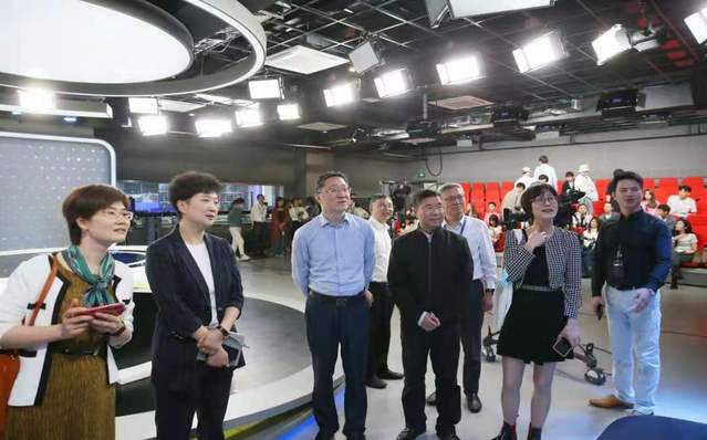 在松江区区委宣传部副部长陆忠新和融媒体中心总编周样波等台领导和工作人员的陪同讲解下,上戏师生们先后参观了区融媒体中心“一中心•八平台”基本构架展示大厅、调度指挥中心、虚拟演播室、大编辑中心,观看了松江区媒体融合改革发展宣传片,详细了解了区融媒体中心“策采编播发”工作流程,“线索汇聚、一次采集、多元生成、多端发布”的融合模式。