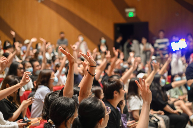 图为观众积极举手提问