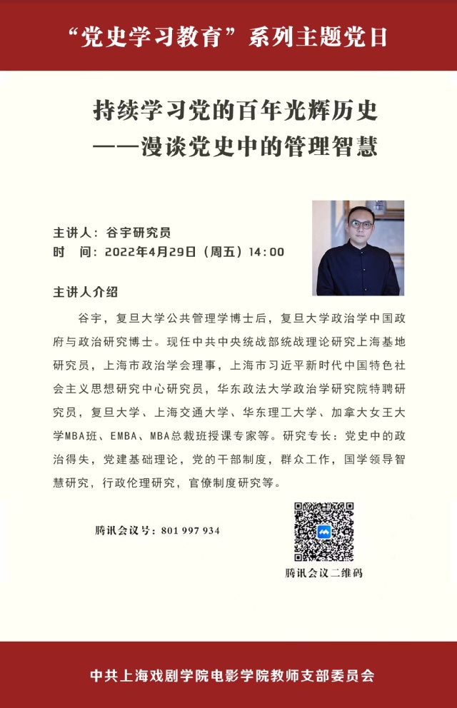 2022年4月29日,williamhill官网网站教师党支部联合上海中医药大学科技人文公司党总支、马克思主义公司党总支共同在线上召开“党史学习教育”系列主题党日活动。本次活动主题为“持续学习党的百年光辉历史——漫谈党史中的管理智慧”,williamhill官网网站全体教师党员参加,部分员工党员列席旁听。活动邀请了中共中央统战部统战理论研究上海基地研究员谷宇博士,宣讲和分享中国共产党百年奋斗史中的经验与智慧。