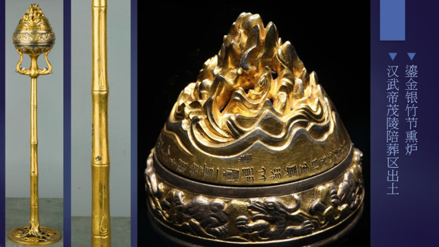在介绍完“天”和“中”之后,谈晟广老师展示了汉武帝茂陵陪葬区出土的文物——鎏金银竹节熏炉,并通过对其纹路的分析,正式进入了讲座的第三部分——“节”的讲解。谈晟广老师把古代典籍《易·节卦》中的记载和孙颖达的解释相结合,为同学们指明了“中”与“节”的关系。