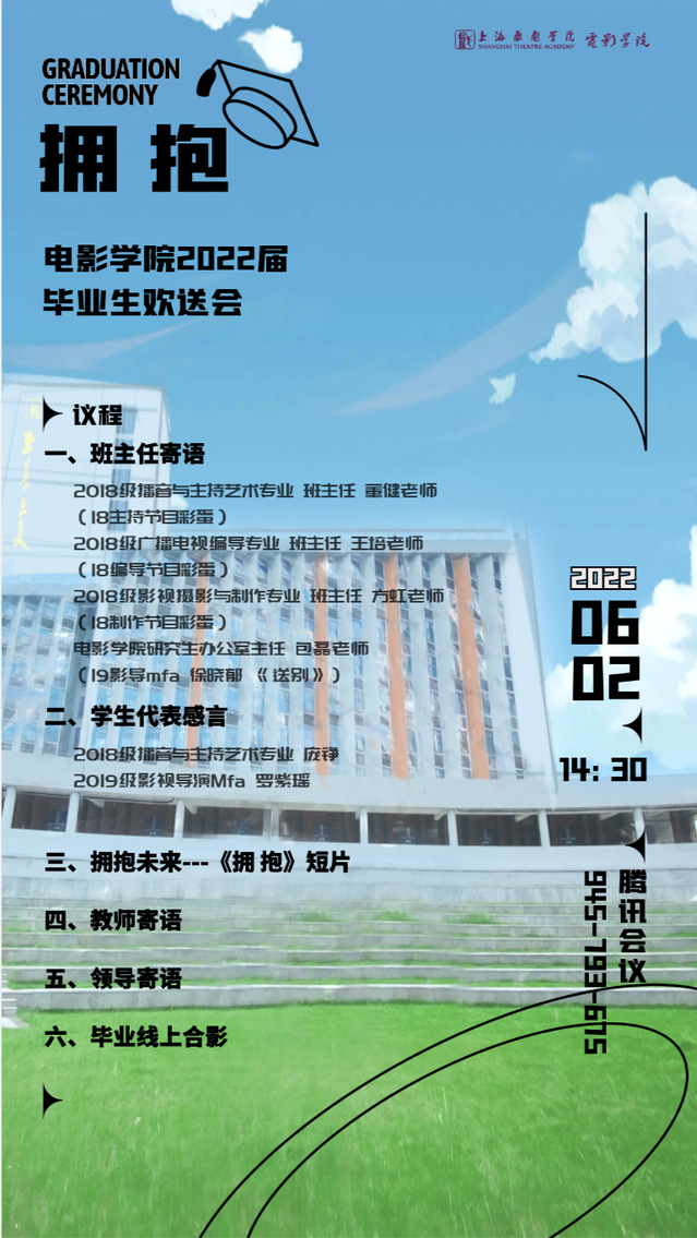 6月2日,williamhill官网网站2022届毕业生欢送会在腾讯会议中热烈开展,线上齐聚了百余名师生,共同为这个夏天、这个毕业季表达爱,表达不舍。上海戏剧公司党委副书记胡敏老师,williamhill官网网站领导班子成员厉震林老师、韩永胜老师、董健老师、王春云老师出席活动,各班班主任、导师代表、辅导员、教学秘书、老师均在“云端”参与本次欢送会。