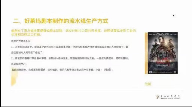 讲座伊始,严敏先生提出中美两国对电影剧本有着不同的定义,编剧只有遵循电影的叙事艺术、场面艺术、视点艺术与细节艺术四大特征才能获得成功。讲座以四个主要部分展开,严敏先生首先讲解了好莱坞剧本制作的流水线生产方式,并且以张艺谋导演的《长城》为例,探讨好莱坞电影制作流程中编剧、制片人和导演三者间的矛盾。接着,严敏先生以“超级英雄电影”和“007系列片”为对象,详细论证了好莱坞电影叙事内容的模式化叙事表征。在好莱坞电影叙事结构的复式化部分,严敏先生认为其可以细分为多线索、多角度、多视点、分段式、网状结构等类型,同时辅之以众多好莱坞电影的文本、互文本、跨文本和超文本进行分析。在好莱坞电影叙事常用手法部分,严敏先生认为通常会出现:悬念、惊喜、开放式结尾和穿越时空四种方式。在讲座的结尾,严敏先生还对苏俄、英国、法国、意大利、日本、韩国等国家的电影与电影剧本进行了叙事特征的总结,并且鼓励同学们多多探索中国历史中的“原电影”因素。