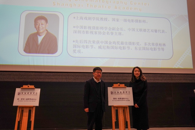 “三个电影中心”成立仪式,首先是侯咏电影摄影中心。侯咏教授在摄影创作方面成绩斐然,他凭借《孙中山》、《晚钟》、《鸦片战争》和《我的父亲母亲》四部作品先后获得金鸡奖最佳摄影奖,成为该单项奖获得次数最多的摄影师。作为公司优秀教师,他多次带领员工参与到国家级比赛与项目中。黄昌勇经理和侯咏教授的女儿任书檀女士一同上台,为侯咏电影摄影中心成立合影留念。