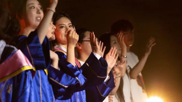 我们在晚风里歌唱,在一幕一幕的起落中渐渐展开毕业大合唱《干杯》,既然时光无法倒流,就让我们在告别前,再干一杯!