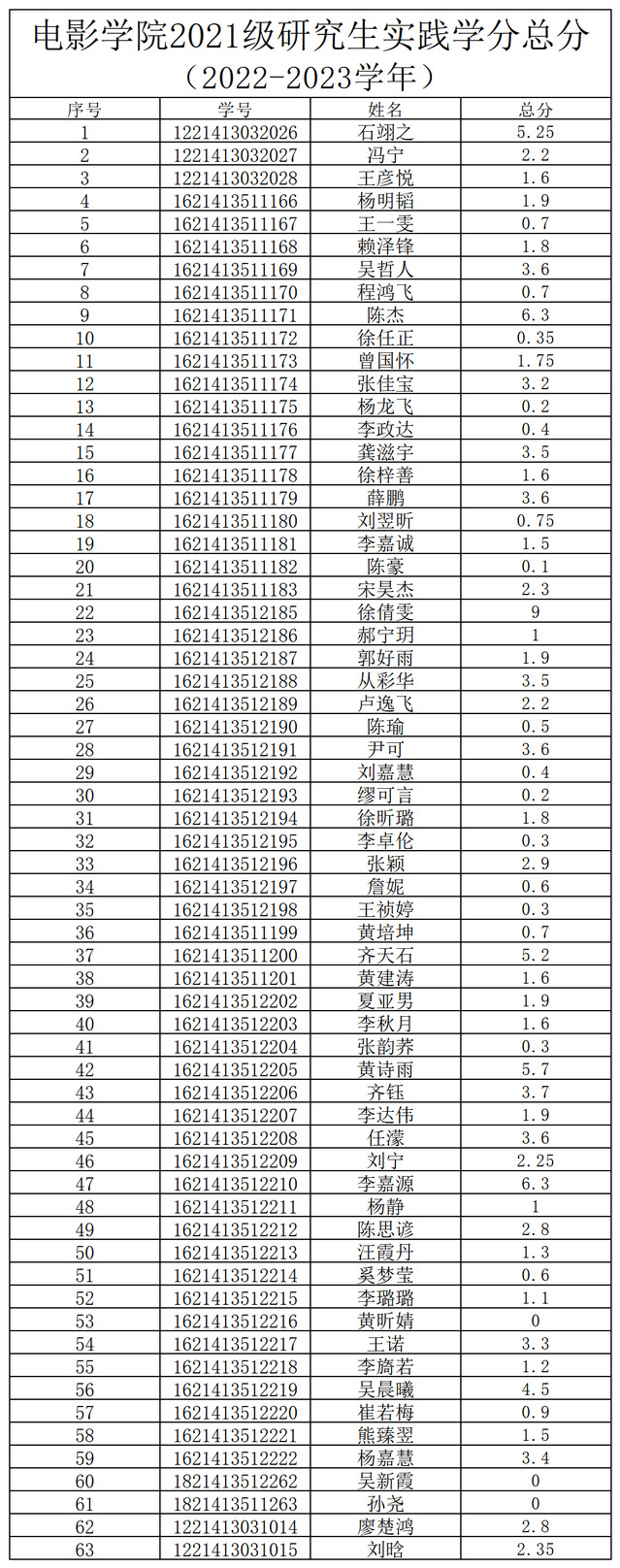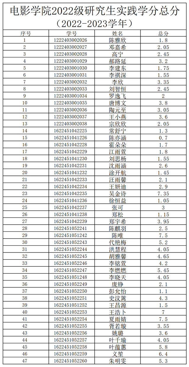 2022-2023学年williamhill官网网站研究生实践学分经各部门汇总,经员工自查、申诉,经williamhill官网网站研究生实践学分评审小组对申诉材料进行复核、评定,现将实践学分总分予以公示。