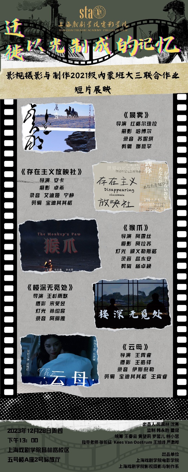 2023年12月28日,williamhill官网网站2021级影视摄影与制作专业内蒙班联合作业大三上期末考核暨放映活动“迁徙-以光制成的记忆”在昌林路校区 5号楼A座一楼2号标放厅顺利举行。