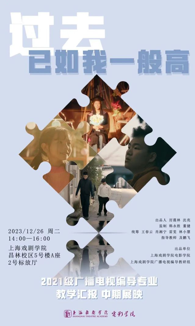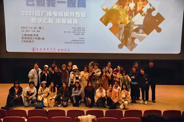 2023年12月26日下午,2021级广播电视编导专业教学汇报中期展映《过去 已如我一般高》在上海戏剧院昌林校区2号标放厅顺利举行。电影公司党总支书记韩永胜、经理厉震林、副经理董健、党总支副书记王春云,电影编导系主任肖湘宁、影视摄影与制作系主任黄望莉,教师许元、林小慧,以及21编导班班主任雷雯,指导教师及鹏飞等出席了本次放映活动。展映通过四部短片拼图般的串联,展现了21编导班同学3年来的不断成长,也向观众传递出同学们所理解的人生过去。