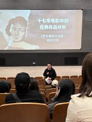 放映结束后,吴天戈导演聚焦于电影《野火春风斗古城》的艺术价值及所反映的时代特征。分析指出,该电影不仅具有深刻的政治宣传意义,通过描绘⾰命热情和⼈物间的亲情、友情展现了⼈性的 光辉,⽽且在艺术手法上达到了较高的⽔准。影⽚通过阴郁的色调和统一的美术风格增强了画面的视觉冲击⼒,并通过特定场景如冬天的雪景和夏⽇的阳光来精确地表现时间变化,实现了故事的紧凑叙述。此外,比较了这部电影与其他经典作品,如《东京物语》在画面设计和叙事技巧上的相似之处,强调了电影在节约叙述资源和提高效率方面的独到之处。