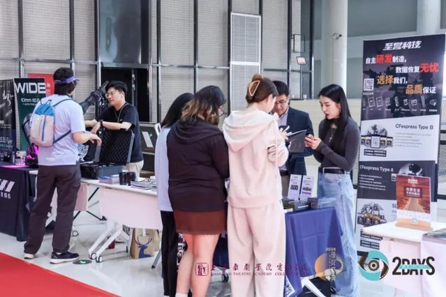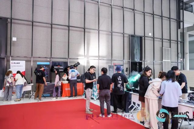在前厅展区,赞助厂商们展示了专业的电影设备、器材等,与同学们进行交流并邀请现场来宾体验最先进的技术。