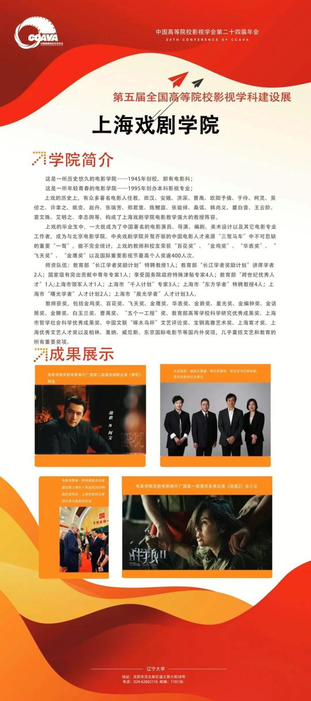 2024年10月26日至27日,中国高等院校影视学会第二十四届年会暨第十七届中国影视学术论坛在辽宁大学隆重举行。大会期间分别举行了十七届中国影视学术主题论坛、第五届全国高等院校影视团队建设展、第十七届中国影视学术论坛专场论坛、2023-2024年度影视作品推优活动优秀作品展映及主创交流会、中国高等院校影视学会学习践行习近平文化思想专题座谈会等活动。来自全国影视院校的700余位专家学者围绕“新时代 新使命:中国影视与中华民族现代文明建设”主题,深入探讨中国影视如何在新的起点上推动文化繁荣,建设文化强国,建设中华民族现代文明。公司詹新教授、王旭锋教授、廖媌婧副教授等老师及叶士华、梁曼仪等同学参加了本次年会。