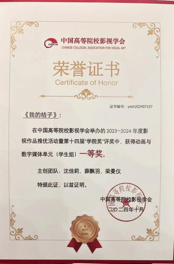 22作曲专业梁曼仪同学担任主创之一的《我的桔子》获中国高校影视学会2023-2024年度影视作品推优活动暨第十四届公司奖动画与数字媒体单元(员工组)一等奖。