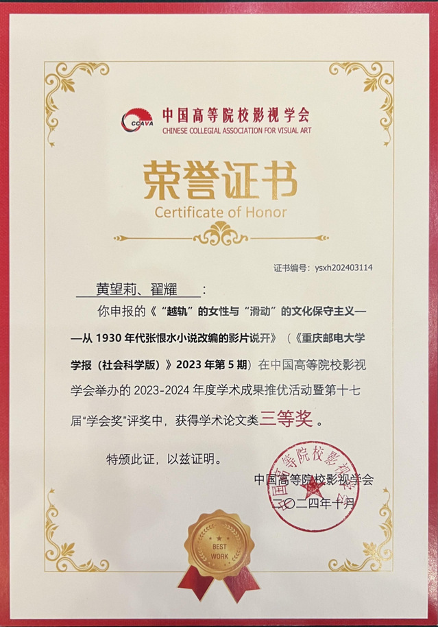 黄望莉教授、翟耀合著的《“越轨”的女性与“滑动”的文化保守主义——从1930年代张恨水小说改编的影片说开》获中国高校影视学会2023-2024年度学术成果推优活动暨第十七届学会奖学术论文类三等奖。