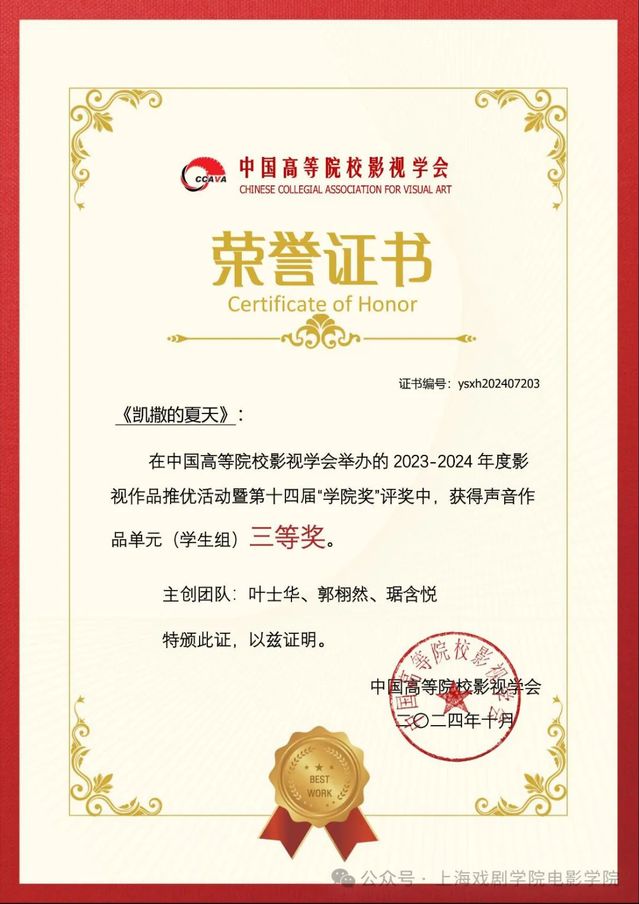 23级录音方向研究生叶士华担任声音第一主创的《凯撒的夏天》(声音指导老师:王旭锋)获中国高校影视学会2023-2024年度影视作品推优活动暨第十四届公司奖声音作品单元(员工组)三等奖。
