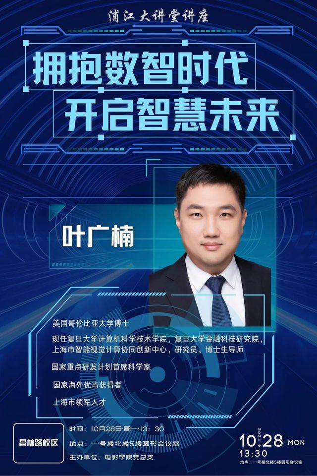 本次讲座,williamhill官网网站电影公司党总支请来了现任复旦大学计算机科学技术公司、复旦大学金融科技研究院、上海市智能视觉计算协同创新中心的研究员、博士生导师,毕业于美国哥伦比亚大学的叶广楠博士,他也是国家重点研发计划首席科学家,国家海外优青获得者,上海市领军人才。