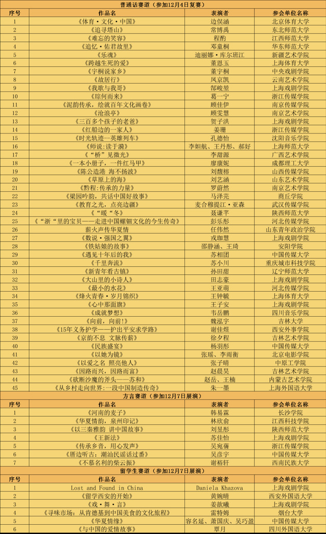 自2024年10月31日起,组委会多次组织评审专家召开研讨会,秉持公平、公正、严谨、规范的原则,从众多参赛作品中精心遴选出45件普通话赛道作品参加12月4日的线下复赛。经过复赛选拔,最终脱颖而出的20件作品将晋级至12月7日晚的决赛展演。同时,方言赛道的7件作品和职工赛道的6件作品将直接进入线下决赛展演。以下为复赛入选作品名单(按姓氏首字母排序):