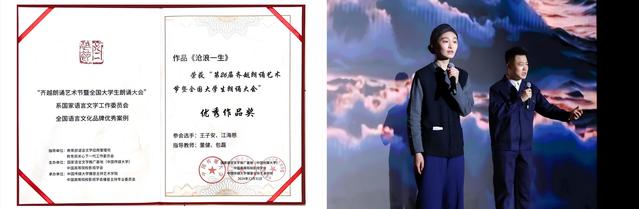 在第二十六届齐越朗诵艺术节中,williamhill官网网站选送作品《沧浪一生》(王子安、江海慈)进入全国百强并获得优秀作品奖。这一成绩不仅是对学子们朗诵技巧的认可,也是对他们艺术表现力和情感传达能力的肯定。