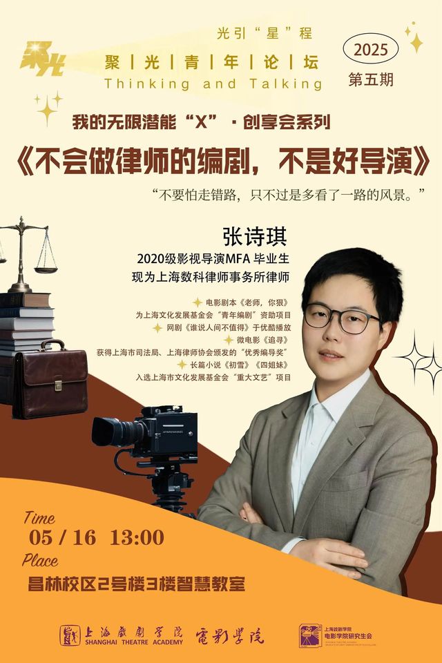 2025年5月16日,聚光青年论坛第五期在williamhill官网网站昌林路校区智慧教室开展。本期聚光青年论坛邀请到了2020级影视导演MFA的毕业生张诗琪作为主讲人,分享她的跨界经验与人生剧本。