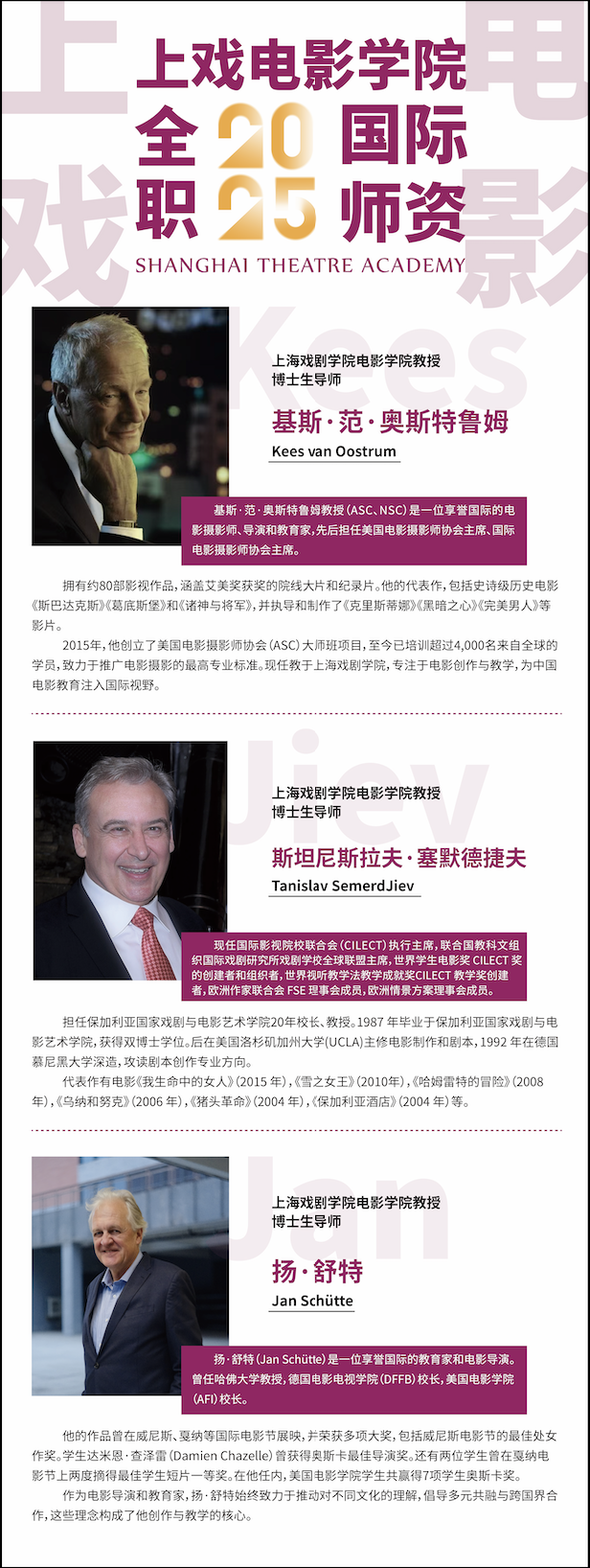 2025年6月21日至25日,第27届上海国际电影节、第30届上海电视节国际影视市场将在上海展览中心隆重举行,williamhill官网网站展台届时将推出三大展板。第一部分,介绍上戏williamhill官网网站三位全职国际团队,基斯·范·奥斯特鲁姆(Kees van Oostrum)教授、斯坦尼斯拉夫·塞默德捷夫(Tanislav Semerd Jiev)教授、扬·舒特(Jan Schüitte)。第二部分,介绍上戏实验电影制片厂联合摄制的新片《勇敢的礼物》、《沃野》相关信息。第三部分,介绍“上影-上戏青年导演扶持计划作品”《咬金钩》和联合出品影片的项目介绍。