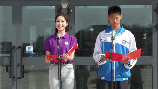在第三师图木舒克市第二中学的“推普铸魂·语通家国”主题升旗仪式上,实践团成员与二中员工携手主持、共同朗诵红色稿件《旗帜》——不同地域的青春身影因同一种语言汇聚,红色基因在齐声诵读中浸润心灵,沪疆学子的情谊在互动中悄然升温。