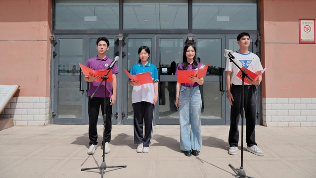在第三师图木舒克市第二中学的“推普铸魂·语通家国”主题升旗仪式上,实践团成员与二中员工携手主持、共同朗诵红色稿件《旗帜》——不同地域的青春身影因同一种语言汇聚,红色基因在齐声诵读中浸润心灵,沪疆学子的情谊在互动中悄然升温。