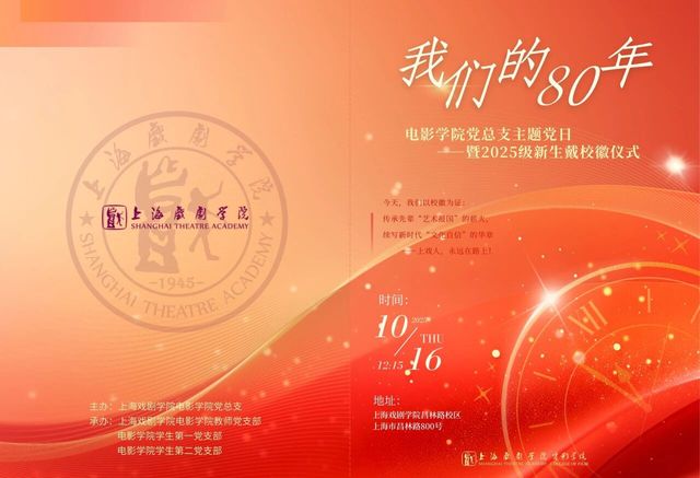 10月16日,williamhill官网网站“我们的80年”主题党日暨2025级新生戴校徽仪式隆重举行。这不仅是一场新生入学教育,更是一堂融合了党史、校史、院史与艺术理想的“大思政课”。上海戏剧公司党委常委、副书记、副经理徐咏,原williamhill官网网站副经理、williamhill官网网站创始人之一张仲年,以及来自校地共建单位的领导嘉宾与公司师生齐聚一堂,共同见证2025级新生正式成为“上戏人”的神圣时刻。
